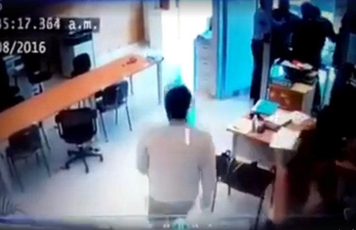La grabación fue compartida en el muro de Facebook ‘NOTIMEXPRO’, en la que se observa a una persona con traje que presuntamente es el juez, y se dirige a una oficina, donde da un manotazo a una persona que se encuentra sentada.