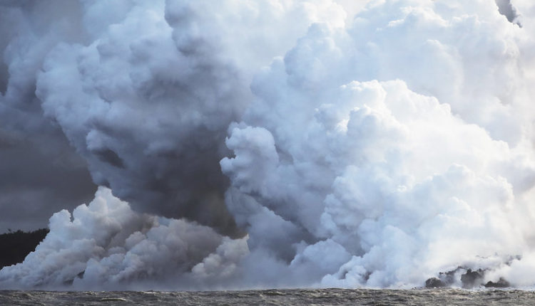 La lava del volcán Kilauea se vierte en el Océano Pacífico cerca de la Isla Grande de Hawái, generando una nube de “Laze” – que las autoridades del condado de Hawai describen como ácido clorhídrico y vapor con finas partículas de vidrio – en el aire. Los funcionarios dicen que es una razón más para evitar el área.